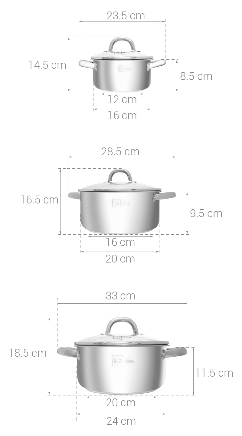 Nồi 16 cm: 16 x 8.5 x 23.5 cm, Nồi 20 cm: 20 x 9.5 x 28.5 cm, Nồi 24 cm: 24 x 11.5 x 33 cm