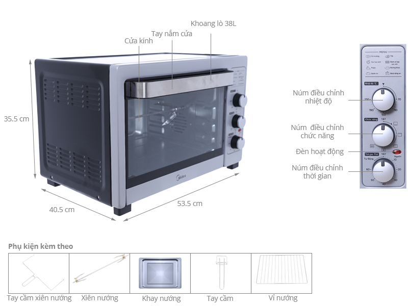 Lò nướng Midea MEO-38AGY5 có dung tích đến 38 lít, đáp ứng tối ưu nhu cầu nấu nướng của gia đình có đông thành viên.
