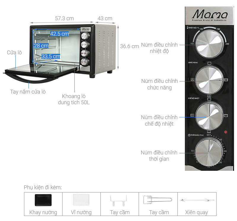 Lò nướng Sunhouse Mama SHD4250S 50 lít dung tích lớn, trang bị nhiều chức năng, tiện ích cũng như phụ kiện đi kèm giúp hỗ trợ tối đa người nội trợ trong quá trình nướng thực phẩm.