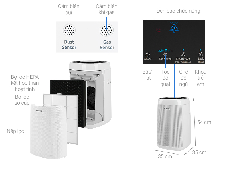 Bộ lọc 3 lớp gồm màng lọc bụi thô - màng lọc than hoạt tính - màng lọc HEPA loại bỏ được phấn hoa, khử mùi không khí, giảm được các loại khí độc hại khác như formaldehyde, xử lý tốt bụi siêu mịn PM0.3, bụi PM1.0, PM2.5.