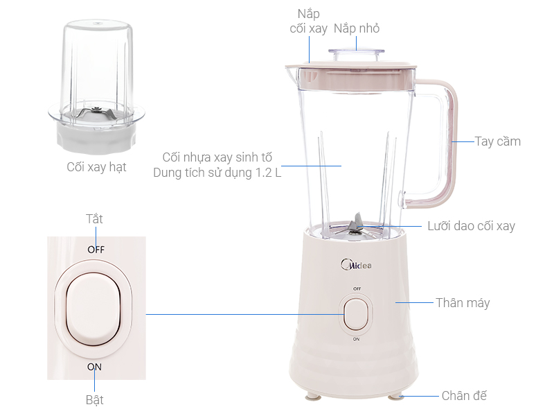 Nên người dùng dễ quan sát bên trong cối khi đang xay thực phẩm, tiện lau chùi. Cối lớn có dung tích 1.2 lít dùng để xay sinh tố, cối nhỏ có dung tích 0.2 lít dùng để xay hành, tỏi, tiêu, ớt,...