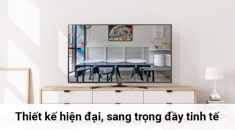Smart Tivi LG 4K 49 inch 49SM8100PTA có thiết kế chân trụ mang kiểu dáng bán nguyệt độc đáo, thanh lịch và tinh tế nhưng vẫn đảm bảo khả năng trụ vững cho sản phẩm khi đặt ở bất kì mặt phẳng nào. Viền siêu mỏng chỉ 0.4 cm, bằng 1/2 iPhone Xr.